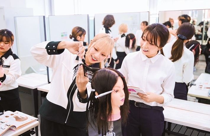 コース授業に加えて、選択授業ではパーソナルカラーやネイル、着付など入学後に自分の好きな講座を選べます。様々な技術に挑戦することができることや全員が美容師免許を取得するので、美容のすべての職種を目指せることも入学の決め手になりました。また、ヘアショーや体育祭、校内コンクールなどクラスで協力して参加する行事が多いので、コミュニケーション力やチームワークを高めることができます。