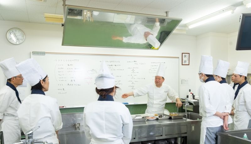 各分野の教員により、少人数制の調理実習や講義が丁寧・真剣に行われ、技術と知識を備えた即戦力となる調理師を育てます。日々の授業・実習は基礎技術をマスターできるまで徹底・反復練習をし、就職については希望に沿った指導、サポートなど一人ひとりに寄り添った丁寧な指導を行っています。
